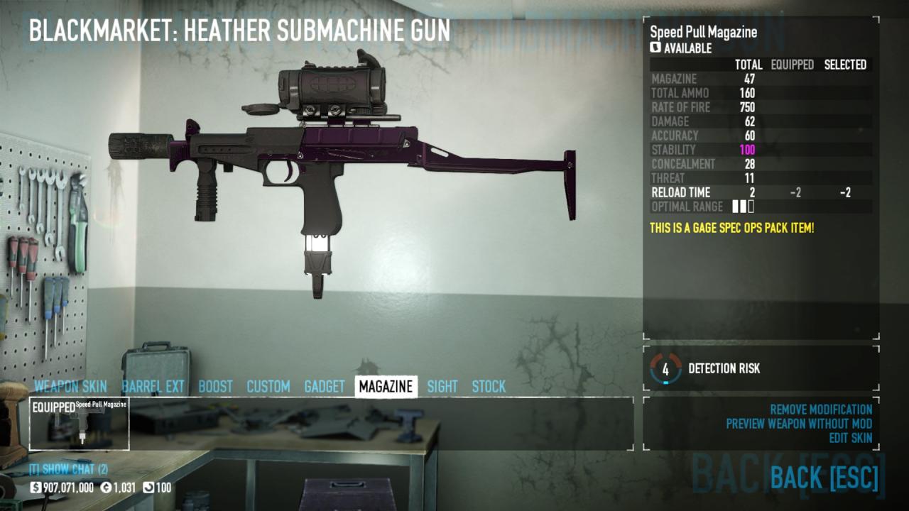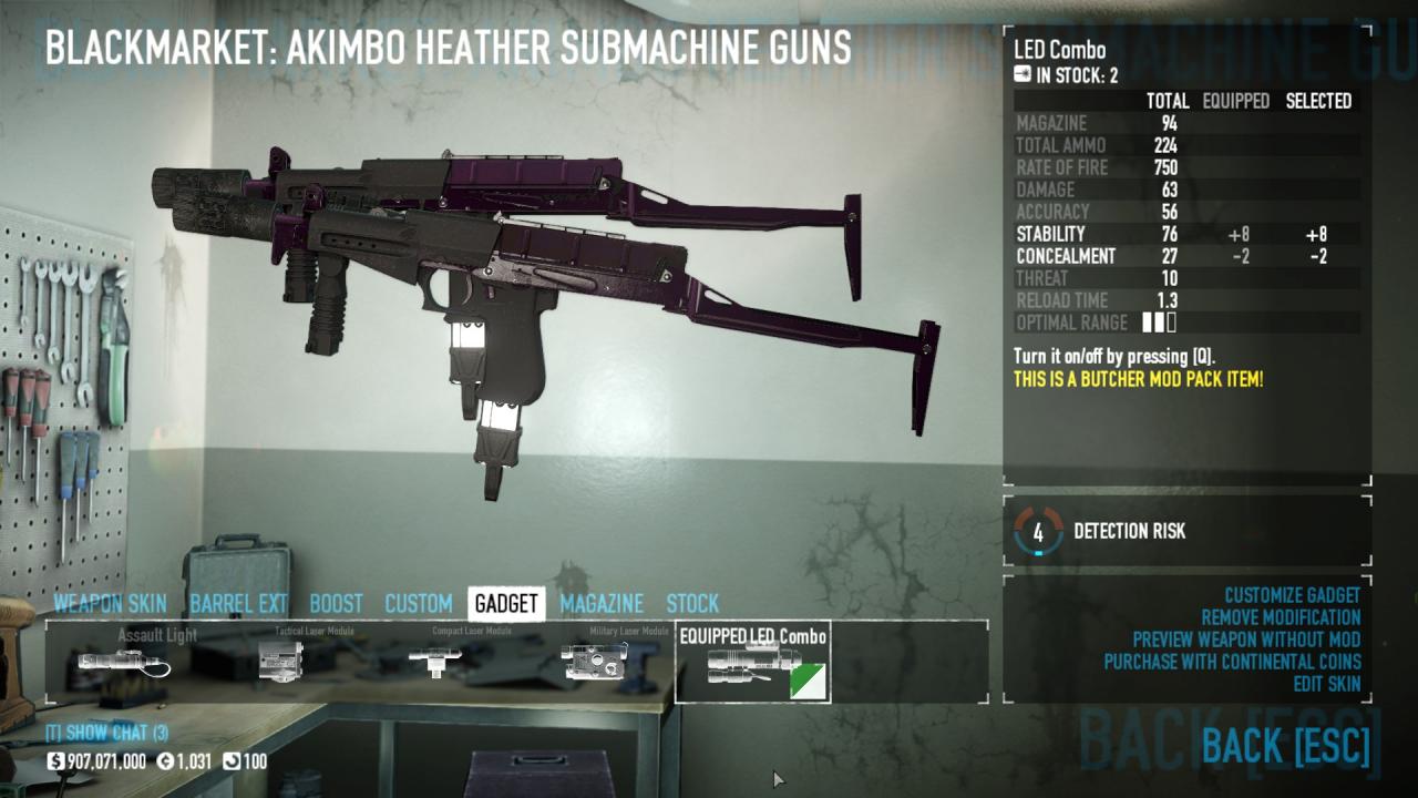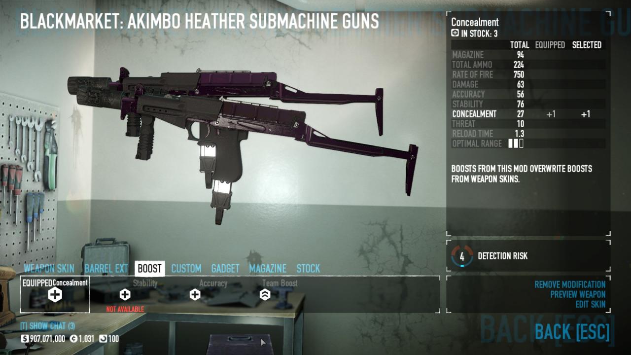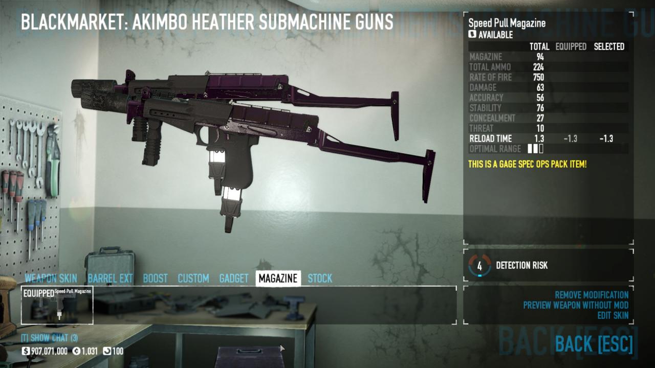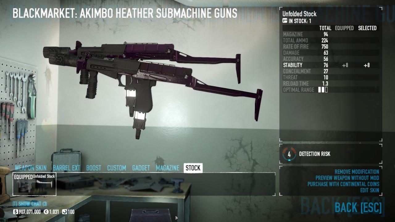 The Primary weapon is the Akimbo Heather SMGs. You will only use these occasionally. They eat through ammo. I use them mainly to either take down a large concentrated group, unload into a Bulldozer’s face, or when the Secondary runs low on ammo. By the time these are empty, the Secondary is usually refilled from ammo drops. Be sure to pick up ammo drops as much as you can. I suggest having them highlighted on the screen. Picking up many stability mods here due to the hit to stability of akimbo weapons. Accuracy not as important due to using this either up close or into large crowds. Stability is to keep it under control. Use smaller bursts if needed.