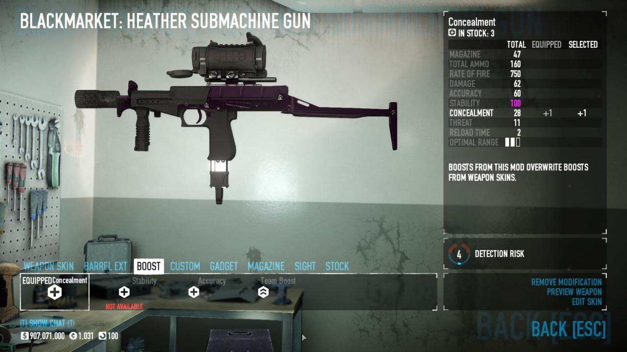 Sight: Any sight with a max of -1 to concealment. Any sight with -2 or -3 will bring your concealment up too high. I choose the Combat Sight, but it is kind of bulky and does obscure the right side of the screen slightly when firing from the hip. Use the sight for longer ranges/sniping, but hip fire the rest of the time.