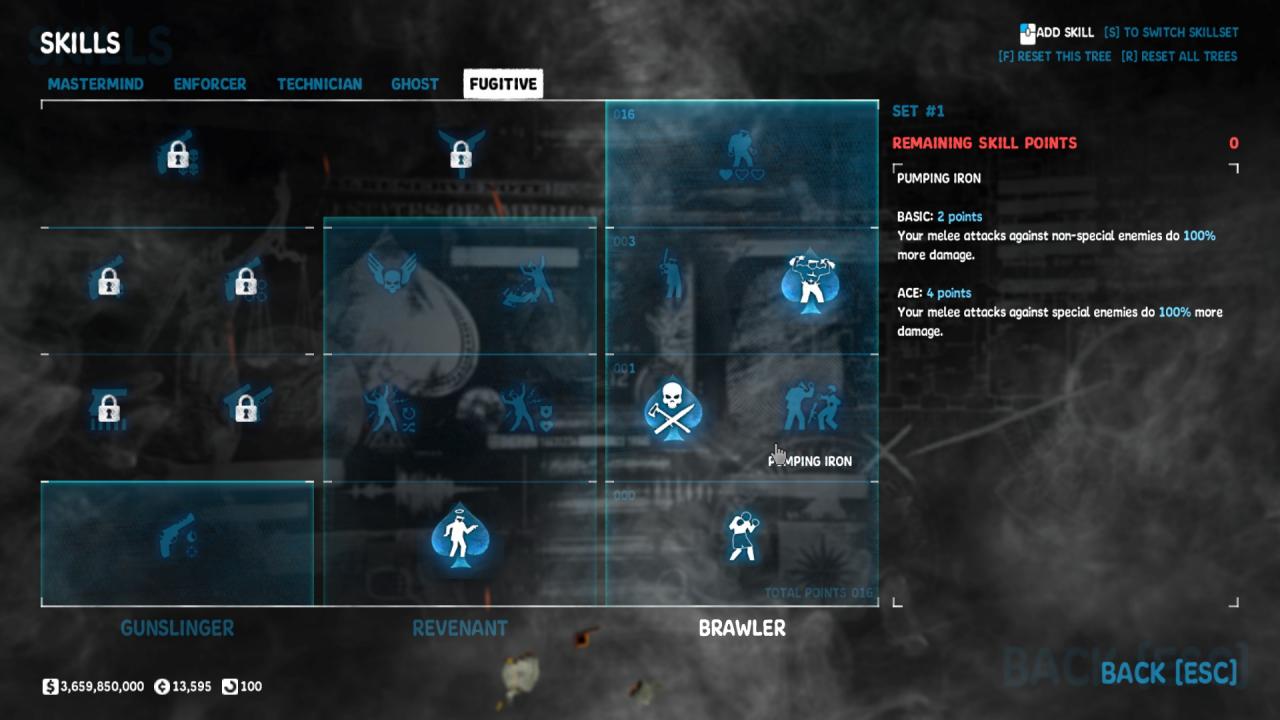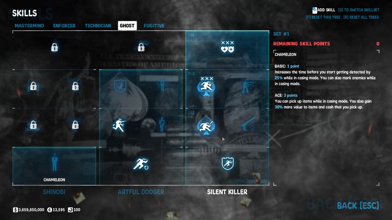 Duck and Cover and Parkour are important when you need to run for ammo or run from a dozen cops. Low Blow Aced so you get the critical hit chance of 30%, and Unseen Strike for a situational crit chance of 35%, not aced because it would remove the crits if you get hit.