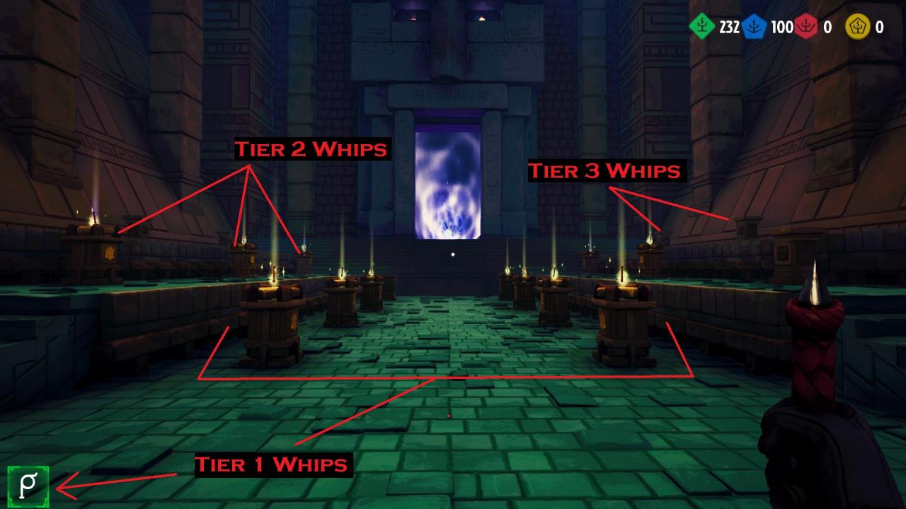 Tier 1 is the lowest and easiest tier to access. All new runs start at floor 1 tier 1. You start with the tier 1 starter whip, and 7 more tier 1 whips can be unlocked. The key and relic flame color is green. Tier 1 temples require lighting 2 braziers to open the relic room.