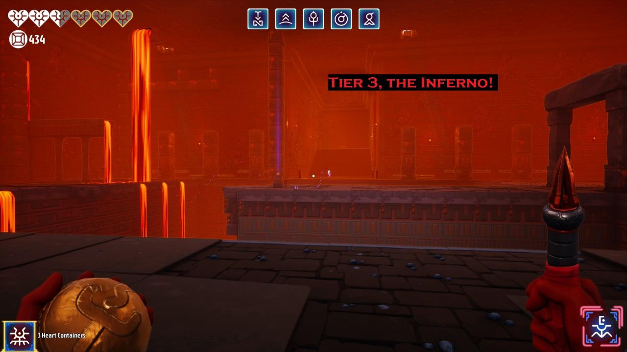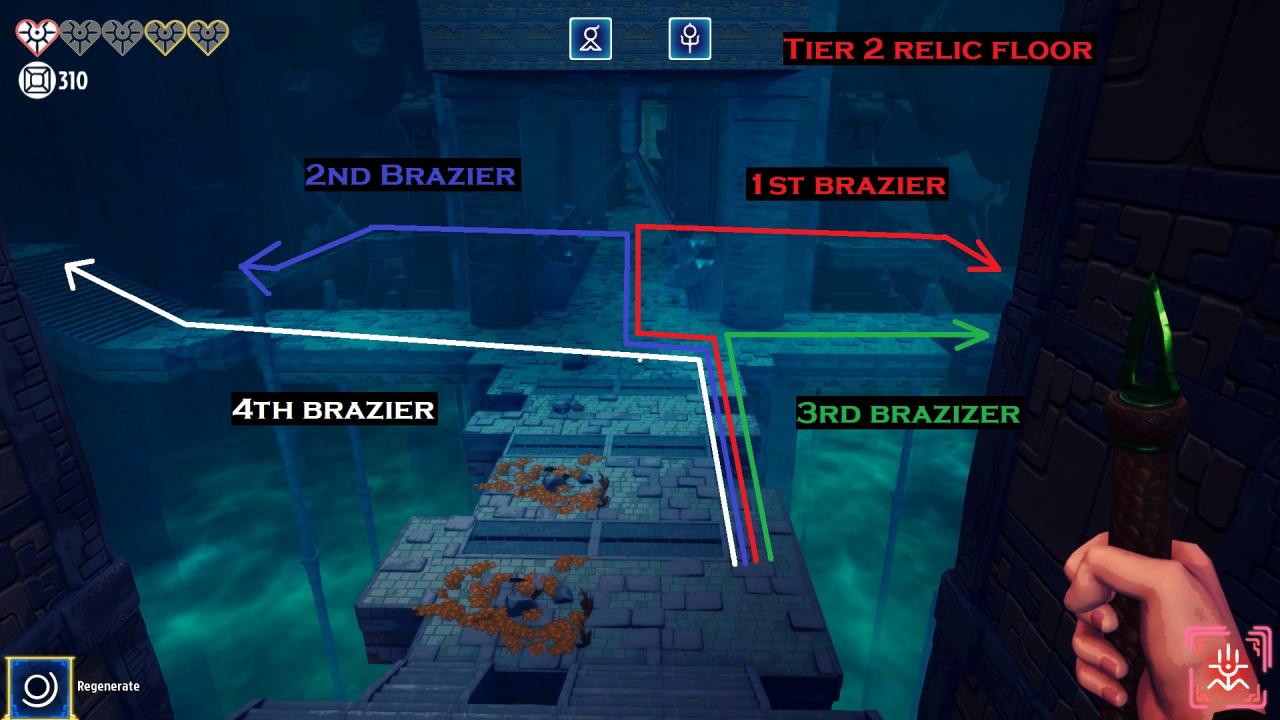 Currently the final temple tier is tier 3, the Inferno. Tier 3 temples add lava and boulders to the mix of obstacles, but still only require lighting 4 braziers to open the relic room. Tier 3 whips are even more powerful, but also more punishing and even harder to bless. This guide won’t cover much of Tier 3 because I am still learning about it. Tier 3 first chamber: