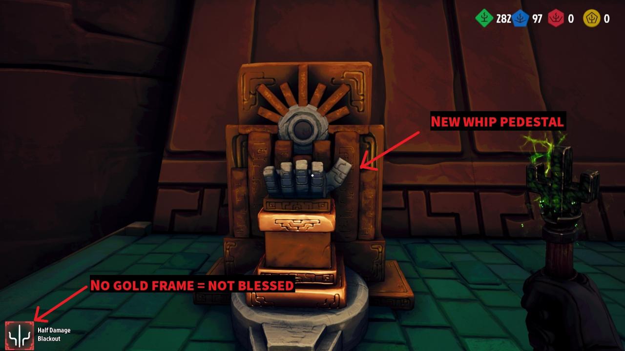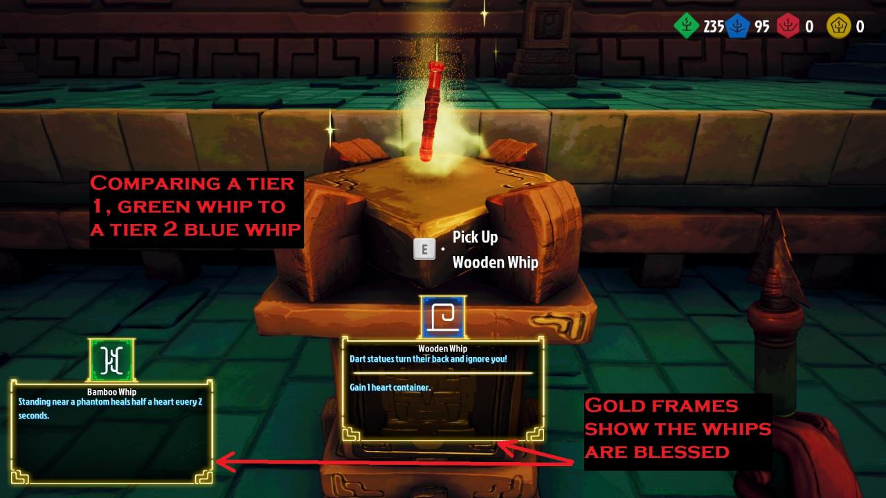 When you get a new whip, it will have one or more positive and negative effects. At first glance, this can make new whips seem worse than the starter whip which has no negative effects, but you can bless a whip to remove the negative effects. To bless a whip, you must claim a relic of a tier equal to or greater than the tier of the whip. For example, claiming a tier 1 relic with a tier 2 whip will NOT bless the whip, but claiming a tier 2 relic with a tier 1 or tier 2 whip will bless the whip. Blessing a whip is different than buying a blessing with treasure at a shrine.