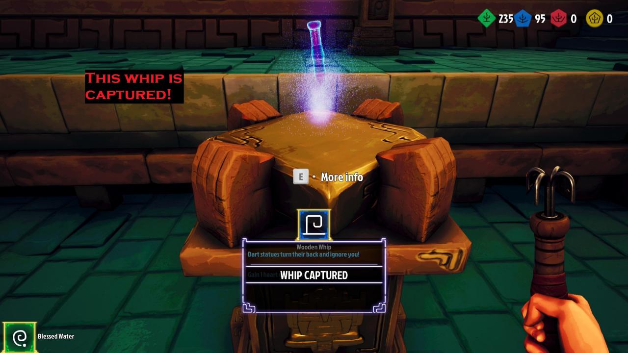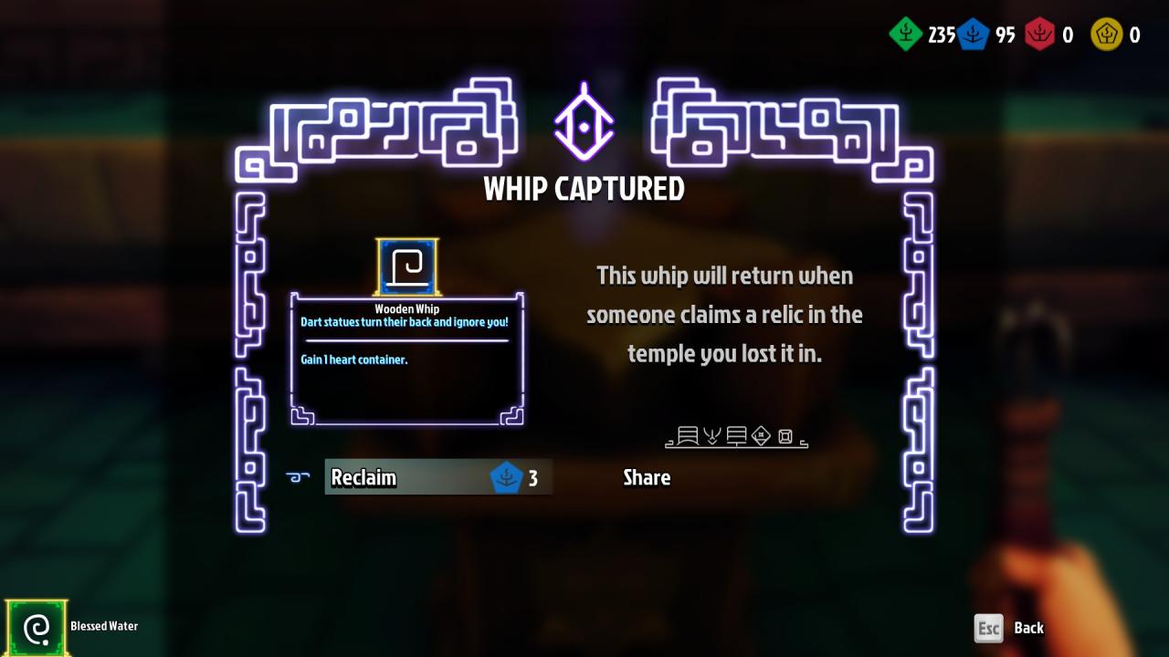 If you die on a run, that whip will be locked until someone else claims a relic in that temple, or you pay some keys of the whip’s tier to unlock it. Locked whips have a purple icon. Interact with its pedestal to buy it back. Alternatively, you can copy the code from the altar and send it to a friend. If the friend gets the relic from the temple code you send them, you’ll get your whip back.