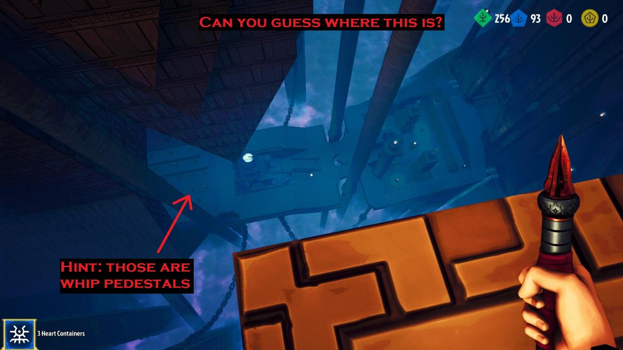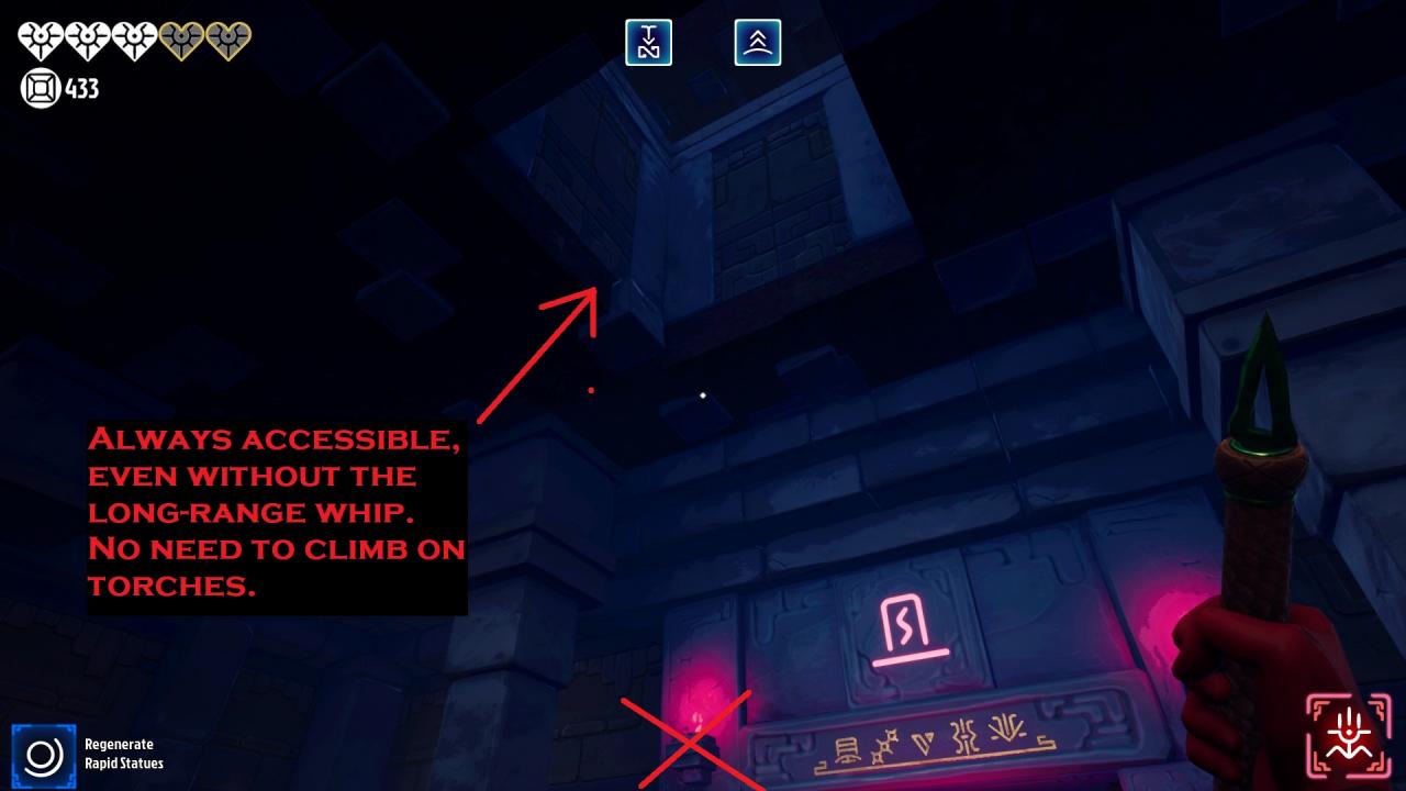 • All ceiling vaults are accessible with all whips, the range enhancement from the shrine is never necessary to reach these ceiling areas.