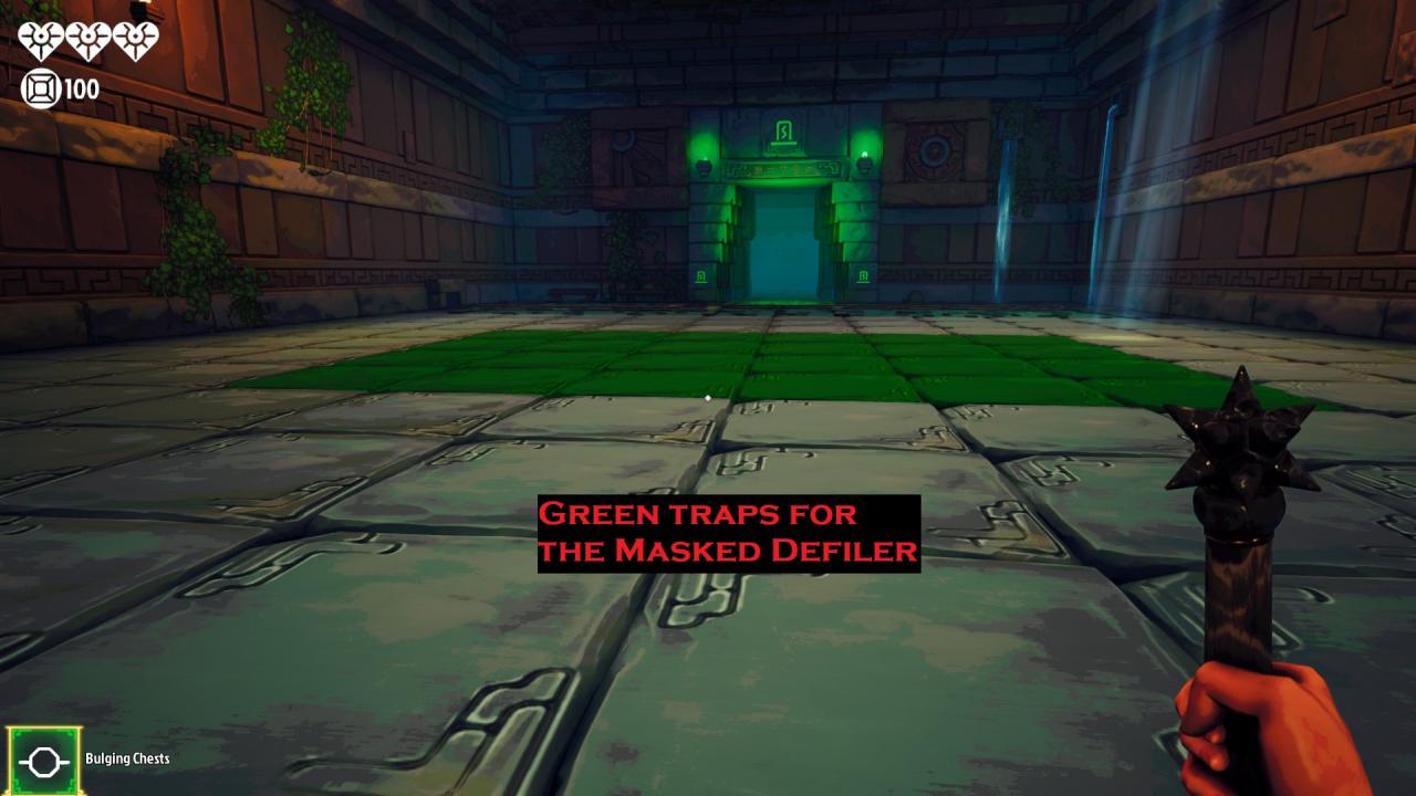 From the hub, you choose a whip and start a new run. A run starts on the first floor of a tier 1 temple. When you spawn on the first floor, you go through a number of rooms filled with traps, and potentially find some rooms without traps that just have treasure chests, called vault rooms. You continue going through rooms until you reach the final, safe room of the floor, the shrine room. On the final floor of each tier of the temple, along with a shrine, you’ll be able to continue to the next tier of the temple, or head to the relic floor. On the relic floor, you’ll have to light a number of braziers to open the relic room door, so you can enter the relic room and claim the relic.