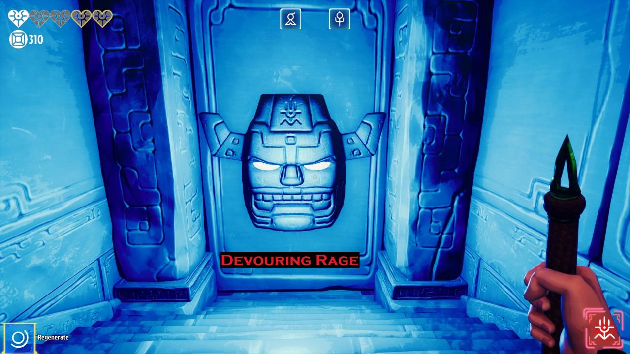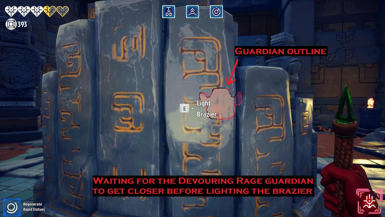 This is the most frightening guardian to deal with, especially for new players, though I will argue not necessarily the most difficult. Pay attention to when he spawns. Until he spawns, you have lots of time to explore and take traps slowly, which is why I think he’s not the most difficult. Other guardians start attacking you and interrupting you immediately once they spawn, but the Devouring Rage just starts travelling towards you when he spawns, so you can continue as normal for a bit. If you move at a decent pace once he spawns, he often won’t get close enough to put you in danger, though you might not be able to get as much treasure. Aside from when he’s really close to you, DR is the most dangerous when he’s near the start of your current room, because if you get crushed by walls or fall off a cliff, you will spawn at the start of the room and he can insta-kill you as you spawn.