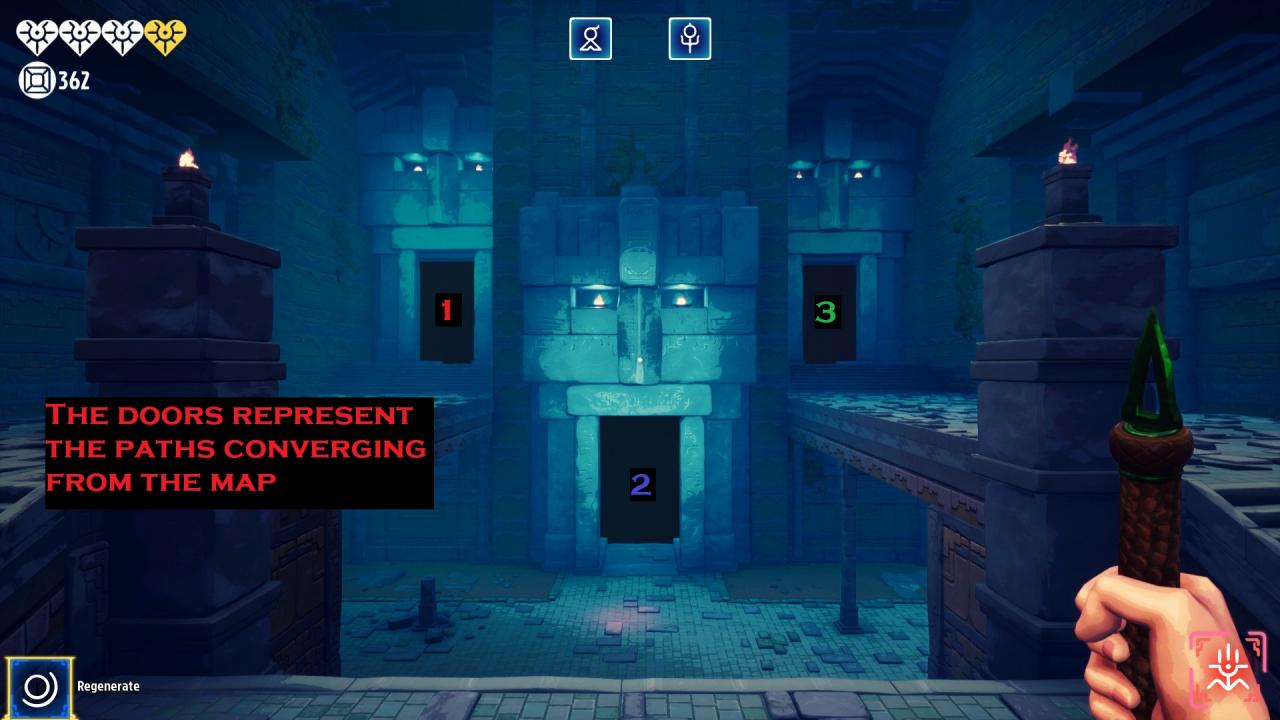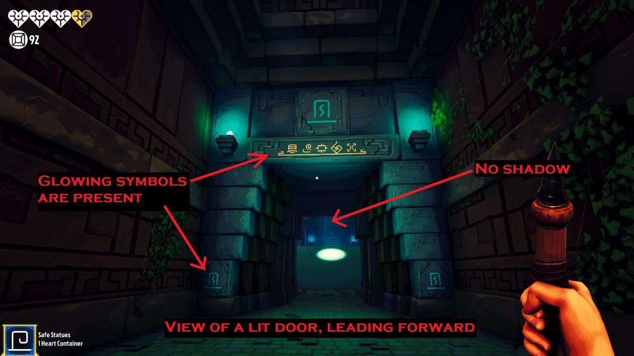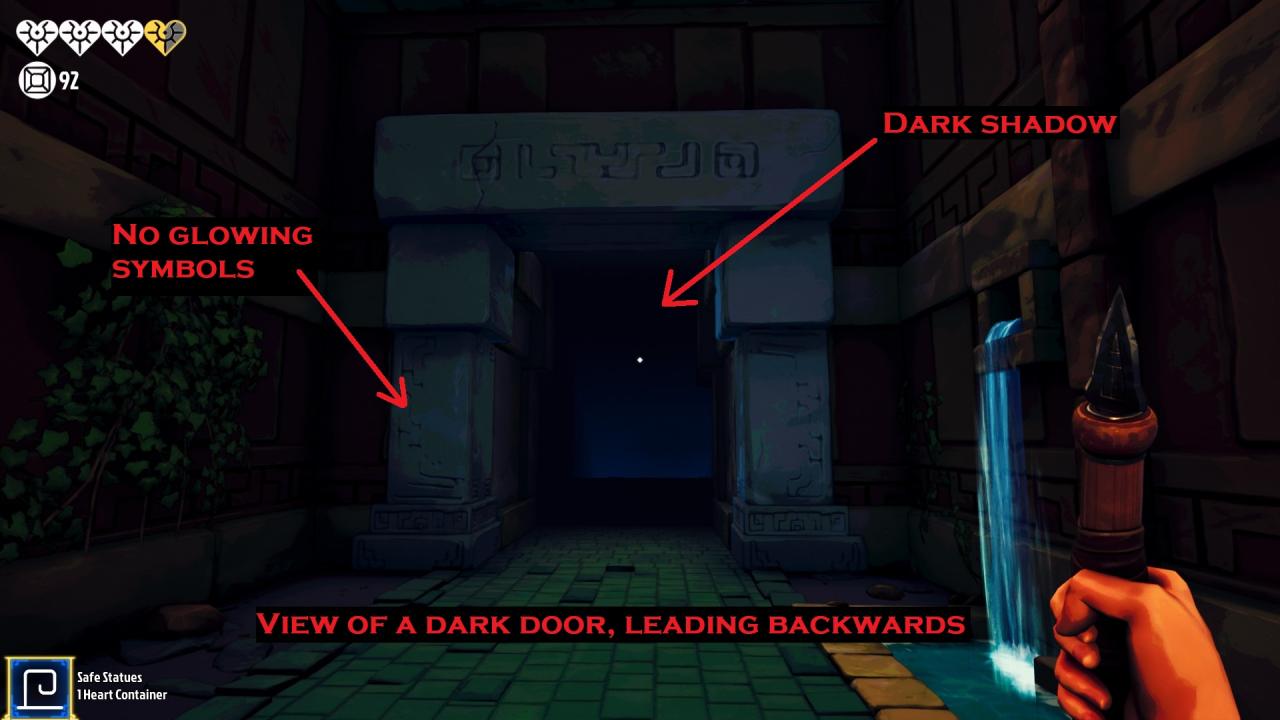 Whereas the door going backwards will have no glowing symbols, and the door will have a dark shadow blocking your vision until you get closer, like the door above on the right.