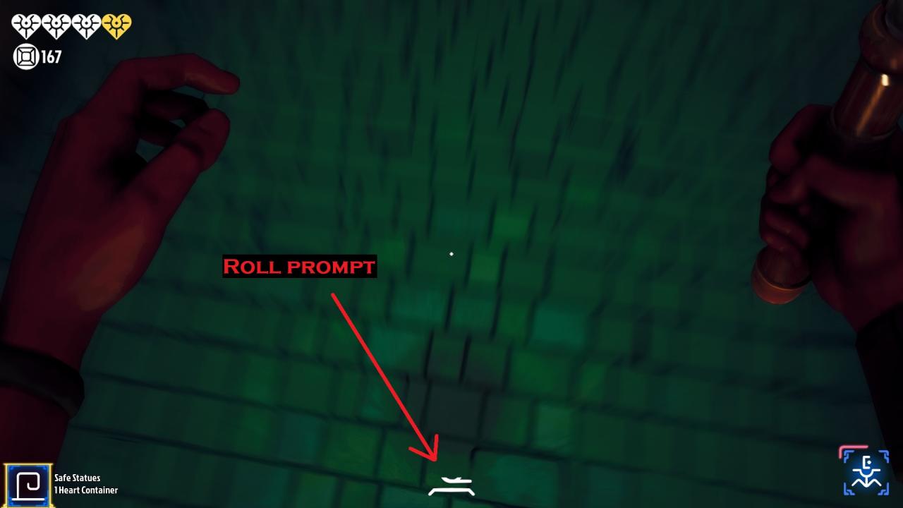 You don’t need to be able to see the floor to know when to press the crouch button to roll and avoid fall damage. Just look for the white icon at the bottom of the screen. When it appears you can press crouch to roll safely (hard to get a good screenshot while falling).