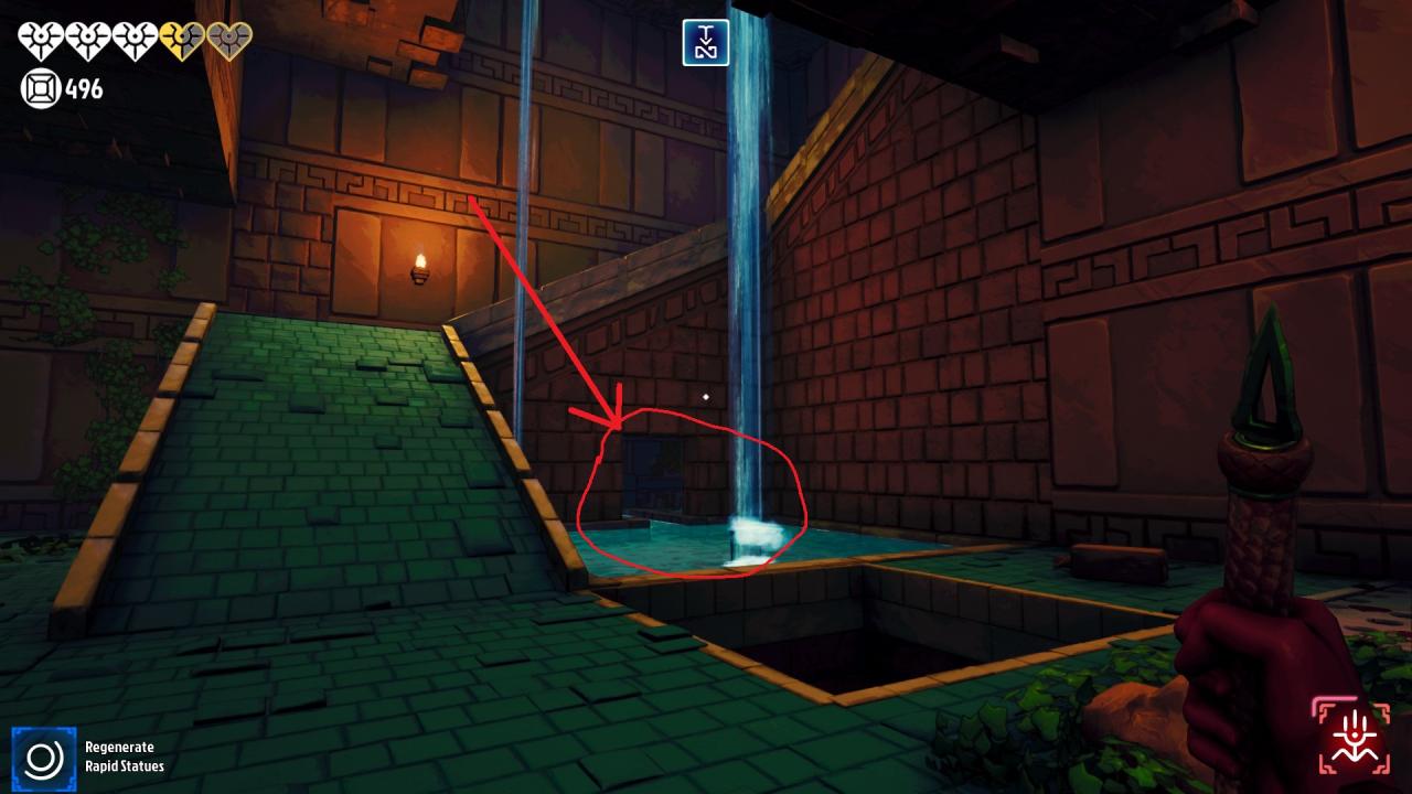 In this room, most people just choose a side and go left or right, getting the chests in the corners. However, if you look closely behind the waterfall in the center there is usually a large chest that most people miss. (no picture yet)