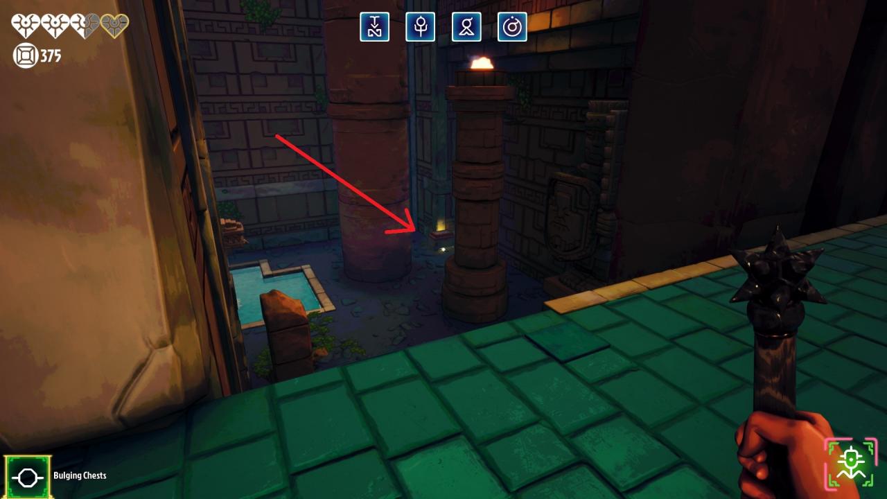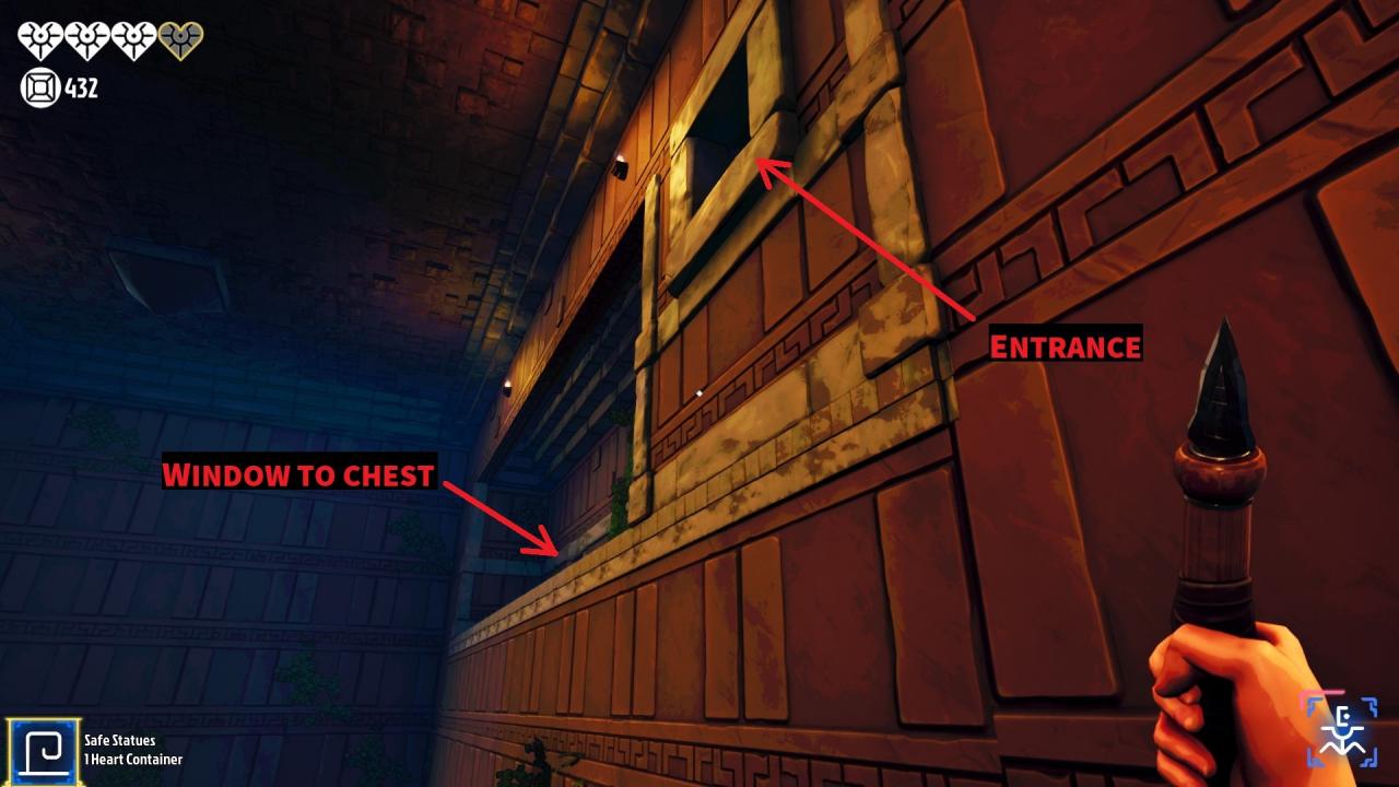 I call this the vent chest because there’s a little window that looks like a vent on one side where you can see through to the chest. You access the chest via a small, raised window, then have to run through some walls of pillars to get to the chest at the end. Alternatively, if someone else has already opened the chest, you can stand next to the vent to collect the coins from the outside, saving you the time of having to go inside.