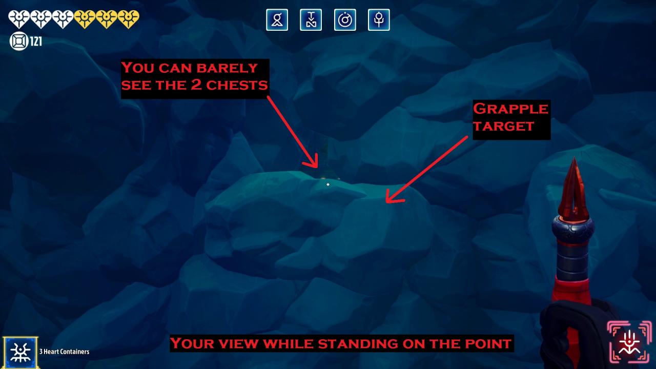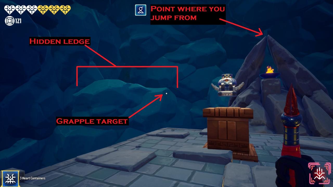 You need to do a mini-run and jump to get some forward momentum, and start gliding with the Wings perk as soon as possible, when you get close enough you can just barely hit the grapple point indicated in the pictures. If you fail to hit the grapple, you can turn around and glide down to a spot on the rocks at the base of the relic tower, where you can eventually grapple your way back up to saftey. If worse comes to worse and you fall in the pit, you’ll take 1 heart of damage and respawn at the entrance to the relic room, so as long as you have 1.5 hearts left, its always worth it to try and jump to the hidden ledge. Here’s your view from the ledge looking back towards the relic: