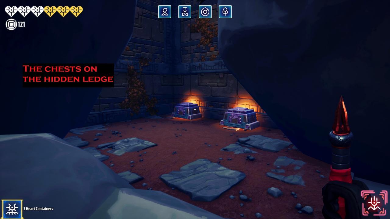 I’m fairly certain you can’t reach this location without the Wings blessing from a shrine, and its easier if you also have long whip or double-jump. You need to stand on top of the rock point behind the tier 2 relic. While standing there and looking towards the hidden ledge, you’ll be able to see the glow of the chests. Your view will look like this: