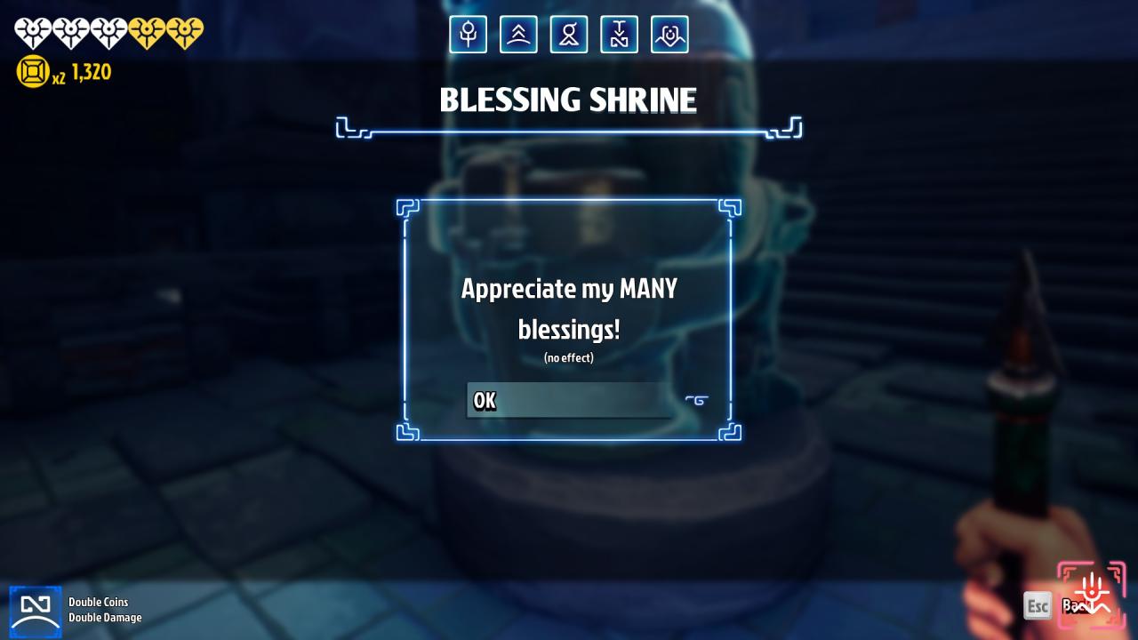 Shrines can be interacted with to spend the treasure you’ve collected to buy blessings. Each time you buy a blessing, you get one new blessing and the cost of buying the next blessing increases, eventually becoming very expensive. Usually you get to choose between two blessings, but sometimes you have only have one option.