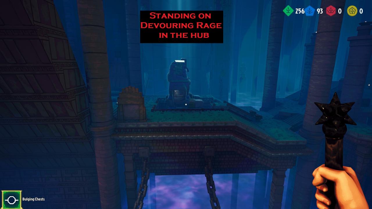 • The altar in the hub room is surrounded by statues of the 3 guardians. Here I’m standing on top of the statue of the Devouring Rage looking back at the altar: