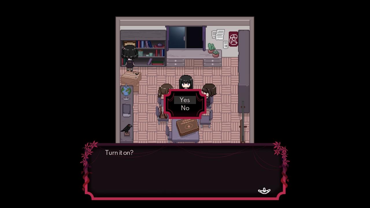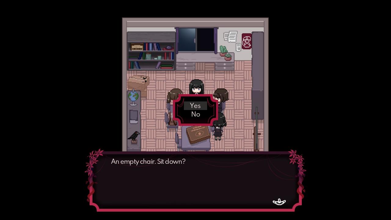 Instead of leaving the room, we can actually take the empty seat next to Kaya as seen in the example below. Press the “Yes” prompt and a cutscene will start involving the girls. All of them will decide to tag along with Kat to see the ritual she’s trying to perform. They’re in for a surprise, because really we just want chalk.