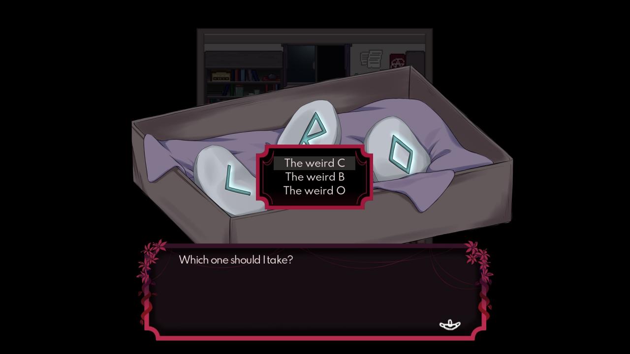 Before we run back over there, there’s a box on the far left of the room, and inside it are runes we need for the ritual. To get to the 7th piece of chalk, we at least need to satisfy the basics of the ritual requirements. This is a job for our trusty friend scissors! Press on the scissors in your inventory while looking at the box, and Kat will open it. Grab any of the ruins, it does not make a difference in our quest for chalk.