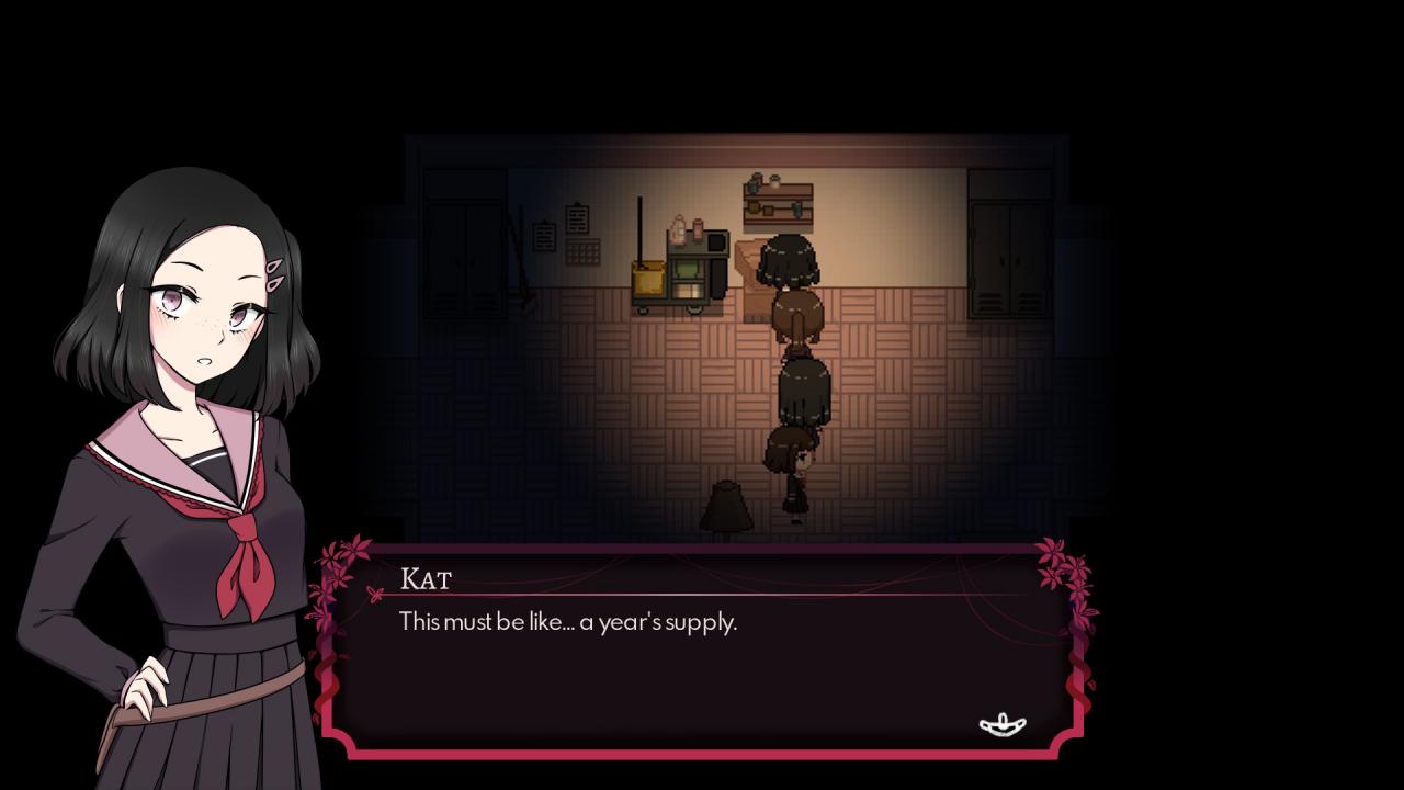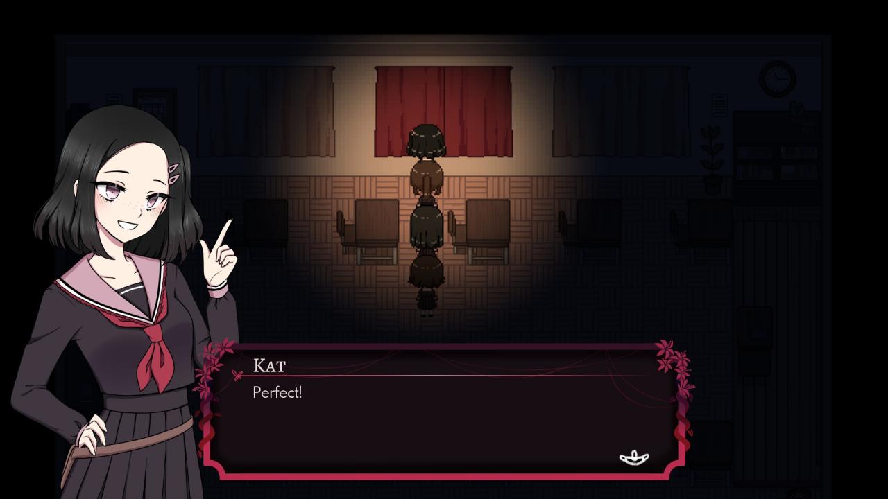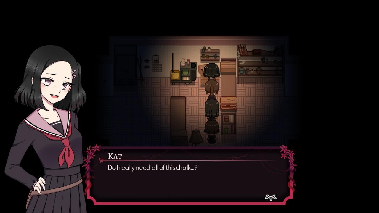 Keep heading right, and you can witness the final cutscene to the Girl’s Night Out ending! Kat and her new friends have escaped the school! I don’t mean Saki, Juli, and Kaya though, I mean the chalk. What else do you think she’s holding in her shirt pocket? the 7 pieces of chalk we snagged of course! Congratulations, you completed the Chalk Completionest Run! I hope your life feels more complete now! Although, I wish we had more chalk…