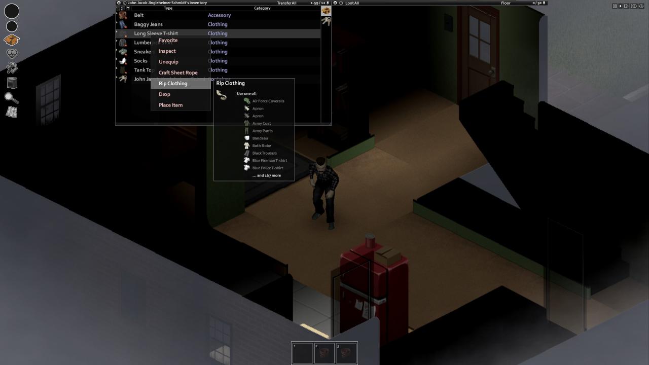 For the first part, open your inventory, find a piece of clothing you do not need, right click, and chose “Rip clothes”. This will provide you with some ripped sheets, which can be used as makeshift bandages. It is mid-July, you do not need to wear a tank top, a long-sleeved shirt, and a lumberjack shirt.
