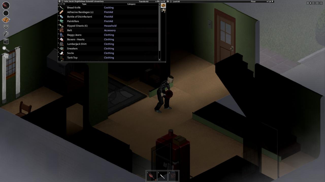 Opening your character screen, you can see what level of protection your various clothes offer. Various clothes offer different rates of protection, and you can even layer up clothes to make yourself significantly harder for the zombies to kill. Some clothes require that you look for them in specific places, some are at the mercy of the random number generator and luck. It should be relatively reasonable to manage to acquire a pair of jeans, offering some protection, as well as a leather jacket or a police deputy jacket. Combat boots seems to also be easier to come by than they were, and offer excellent protection for your feet against attacks.