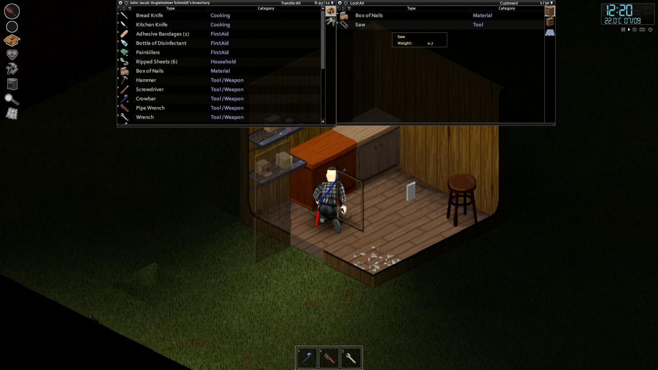 A hammer, a screwdriver, and a saw, constitutes the holy trinity of tools. These three tools together, allows you to start dismantling objects and furniture out in the world, letting you acquire planks you will need in order to barricade up your safe house. An added bonus is that you can now disassemble even (wooden) locked doors from the outside, should you run into a locked door on a building with no other ways of getting inside.