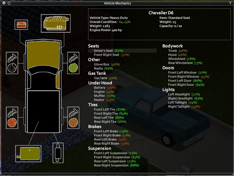 When it comes to assessing that a vehicle is not damaged beyond repair, initially a quick look will tell you whether the car is in one piece, and haven’t been crashed too badly. For further, more thorough assessment, walk up to the hood of the car and tap “E”. This will give you an overview of the cars condition. Parts have status between 0 and 100 %, conveniently colour-coded from green to red for the state of distress.