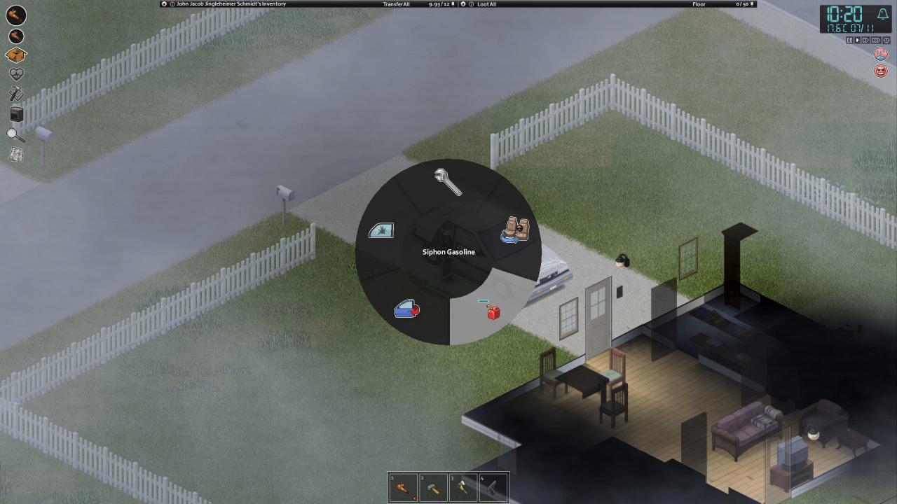Cars have a special user interface of their own, unlike most other things. When either next to, or inside a vehicle, you can bring up a radial menu by tapping “v” by default. This allows you to do things such as breaking a specific window you are standing next to, or while seated in the car doing things such as switching seats, going to sleep in the seat of the car, turning on lights, radio, heater and similar. If you are carrying an empty gas can, standing next to a car and bringing up the vehicle menu, also gives you the prompt of “siphon gas”, if the car has any gas left in the tank.
