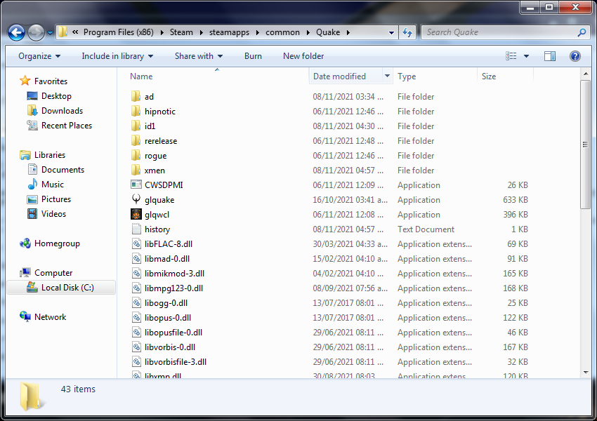 4. Go to the folder where Quake is installed (by default it is “C:\Program Files (x86)\Steam\steamapps\common\Quake”).