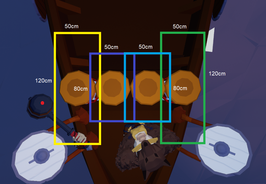 First, let’s start with an explanation of how the game recognizes a hit between the hammer and the drum: a point on the front of the hammer creates a line when moving, which intersects rectangles located on the surface of the drums. The front face of the hammer must entirely exit and then re-enter the top of the drum for the collision to register.