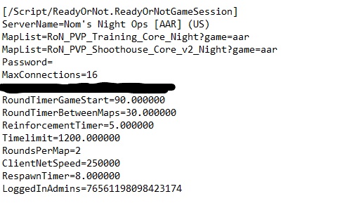 You can customize a lot of things in here, but mainly you’ll be configuring everything at the bottom of the .ini file. Pictured below is my own server configuration, “Nom’s Night Ops” with Arrest and Rescue being the only mode and the maps only night.