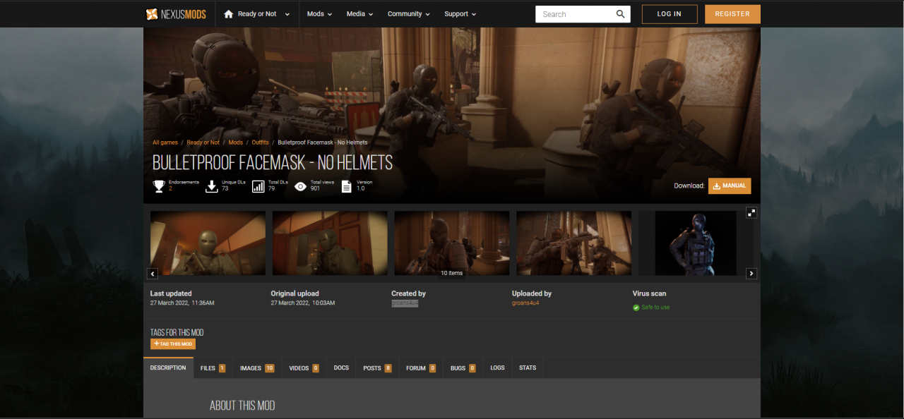 Either of these sites will work, find and install the modification you want. In this guide I will use Bulletproof Facemask – No Helmets by groans4u4 as an example.