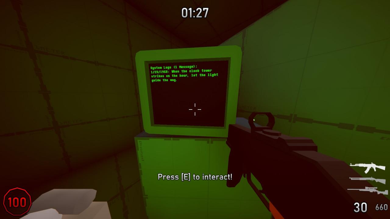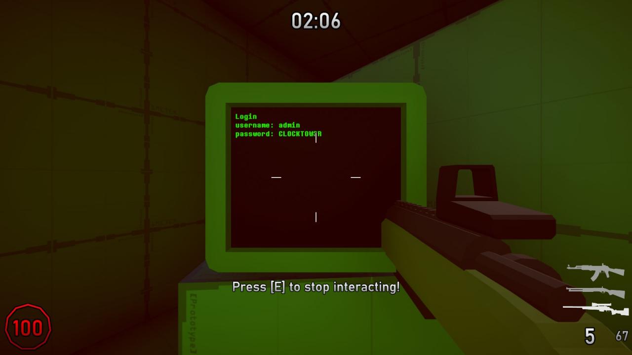 Going through the door will reveal a terminal, interact with the terminal and type the password CLOCKTOW3R