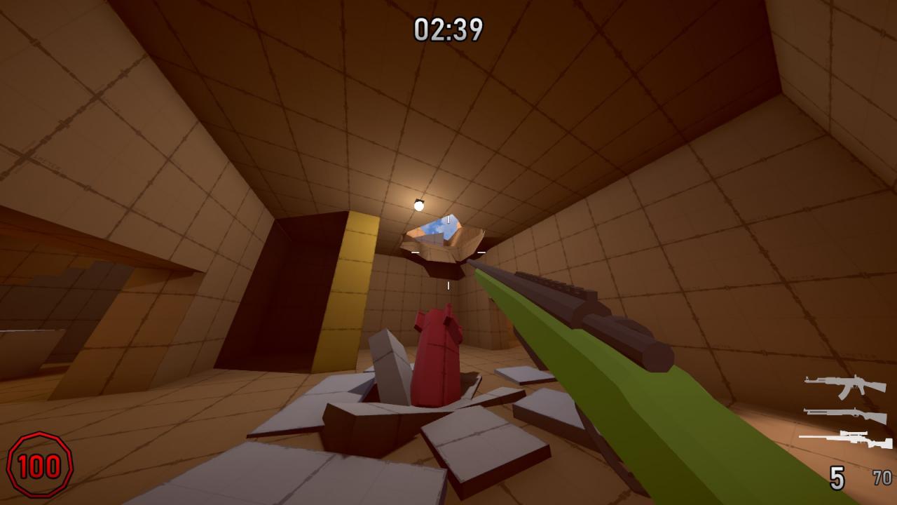 there is a hallway that has some crumbled wall, shoot it to reveal 3 mugs on a table