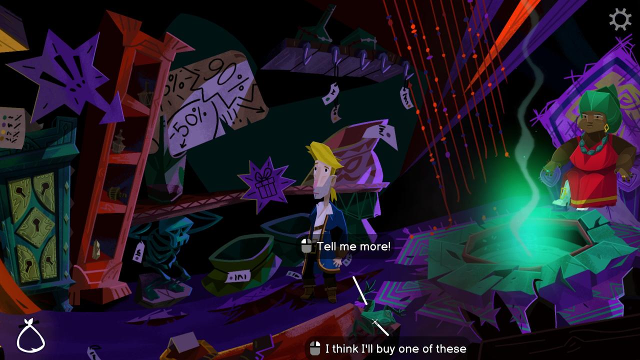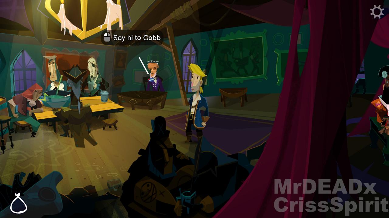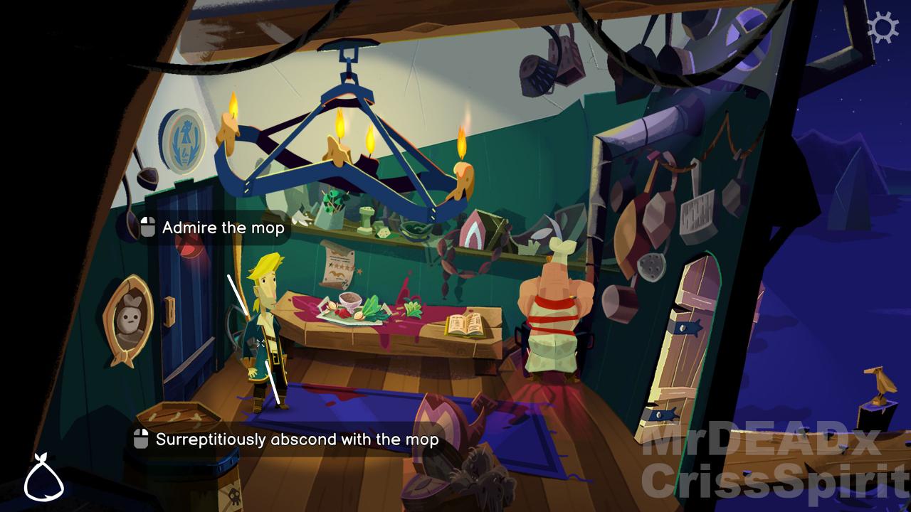 In order to get this achievement you will need to advance with the story until the failed attempt to bargain for finance with the new three Pirate Leaders. After Guybrush will angrily exit the Scumm Bar into the Docks, head towards LeChuck’s ship on the pier and interact with the quartermaster. After exhausting all the dialogue with her and returning to the docks, enter the Scumm Bar and go into the kitchen. Interact with the cook, exhaust all his dialogue options (sending you on the spiritual voyage to craft your own mop) and once again exit the Scumm Bar. Change the scene (e.g. by heading towards the Lookout point) in order to make the Fancy pirate (the nightmare customer) appear at a white table inside the Scumm Bar. Go into the kitchen and talk once again with the cook, exhausting all his dialogue options, learning that the cook needs a recipe in order to prepare a special meal. Exit the Scumm Bar, go into the Low Street and head inside the International House of Mojo. Exhaust all the dialogue options with the Voodoo Lady and inspect the frog on the table (to the bottom left side of the screen). Buy the apology frog and travel to the Governor’s Mansion.