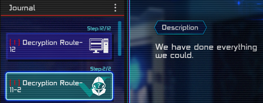 – Finishes “Decryption Route” with Bad Ending.
