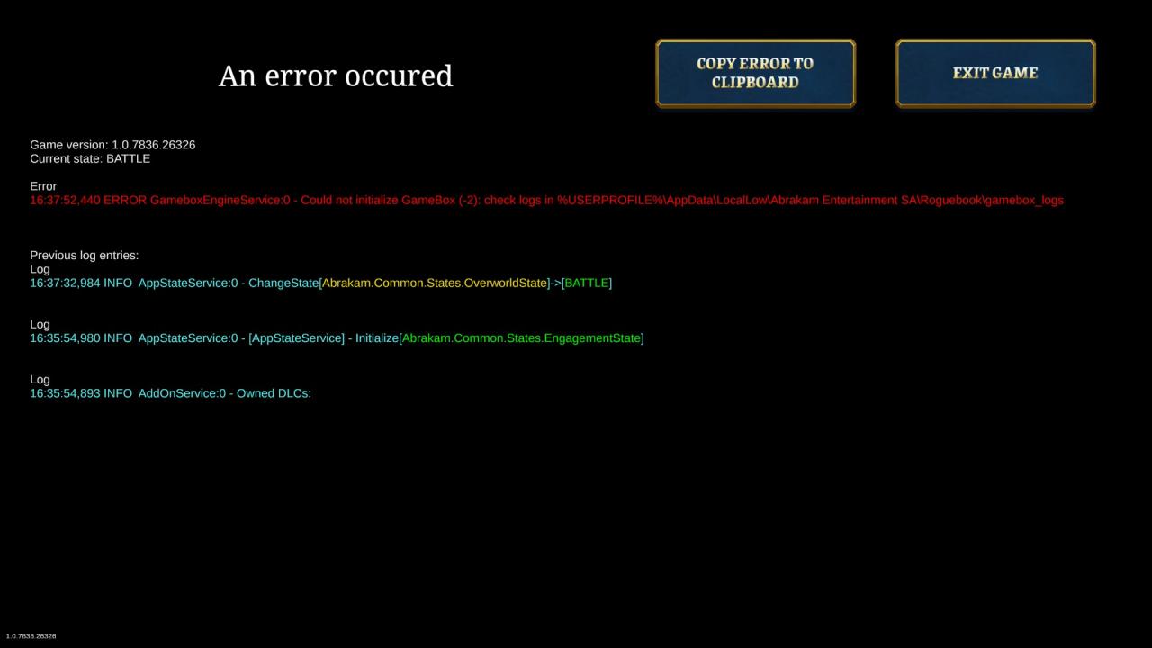 ERROR GameboxEngineService:0 - Could not initialize GameBox (-4): check logs in %USERPROFILE%\AppData\LocalLow\Abrakam Entertainment SA\Roguebook\gamebox_logs