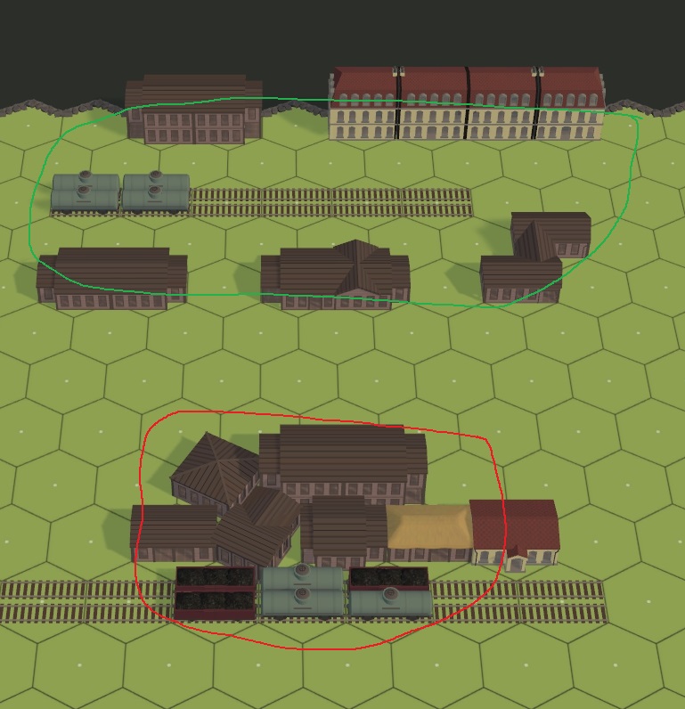With building placement, it is better to use a 2-hex (or larger) building instead of placing 2 (or more) one hex buildings side by side. This is because if the buildings are are single hex, players and the AI will have issues with perceiving them as not connected. Also, don’t make huge clusters of buildings – there should be space between rows of buildings. Plan to have them in a pattern of something like building – road – building or have 2 hexes between buildings.