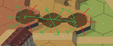 - Trenches have limited access. When placing trenches on hills, be aware that they can only be entered from a same level ground hex, or via other adjacent trench hexes which may be at a different level. The green lines indicate where movement is possible, the red ones are blocked.