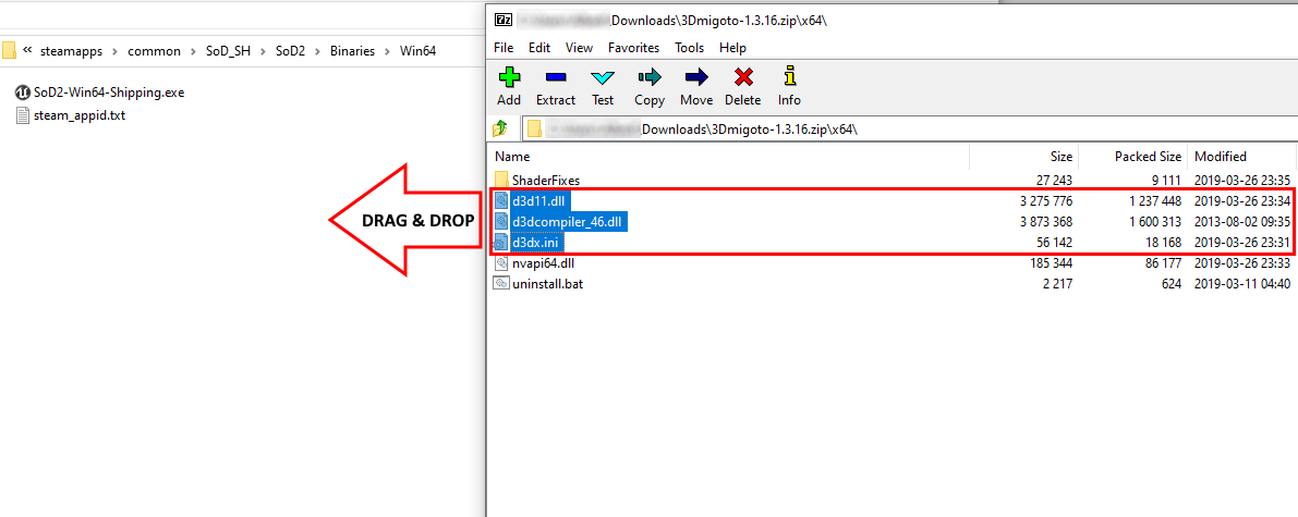 - Open the .zip archive you downloaded, navigate to the x64 folder. Then drag and drop the 3 required files (d3d11.dll, d3dcompiler_46.dll and d3dx.ini) into the game’s Win64 folder.