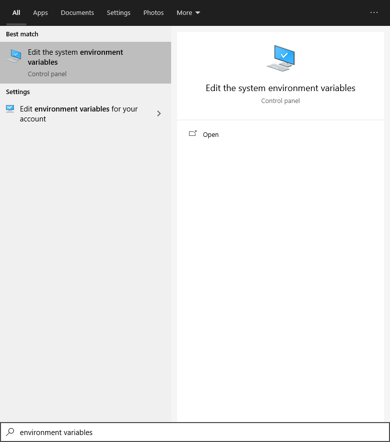 Now that it’s been downloaded and extracted somewhere (in my case to F:\Genesis\SDK), we need to setup the environment variables in Windows. We will need to create two new variables, GDK and GDK_WIN. The first step is to open the System Properties window. Just search “environment variables” into Windows search and it’ll open it up.