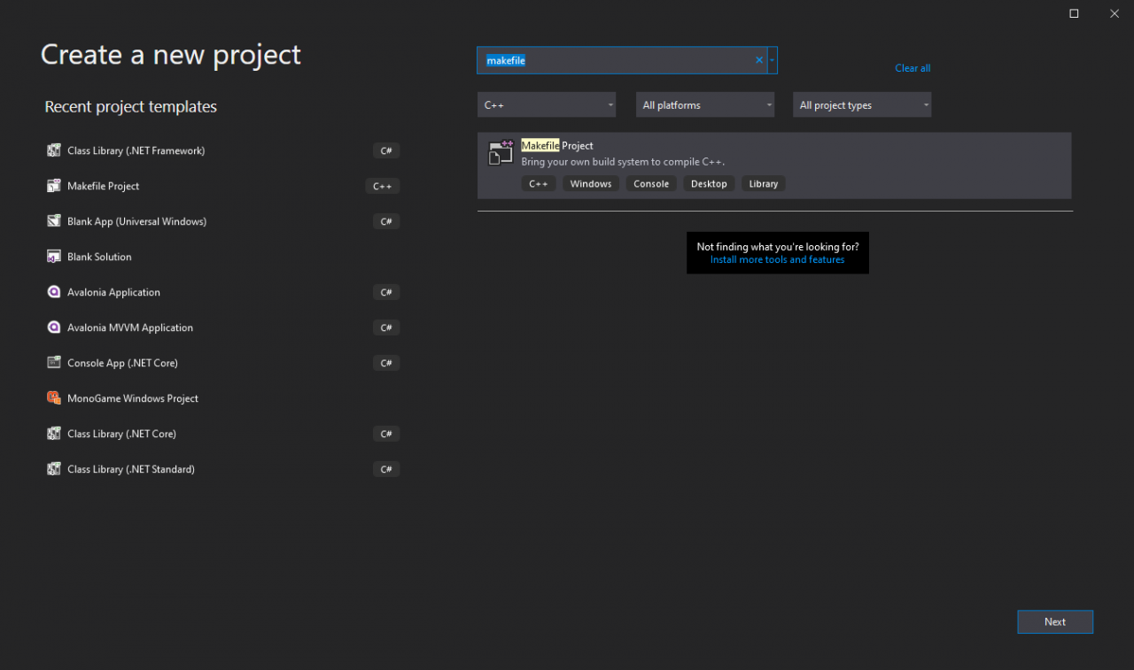 Make sure that your Visual Studio install has Makefile support installed (this can be done through the Visual Studio installer). Open Visual Studio and go to “Create a new project”. In the options, filter down to C++ (I know it sounds weird using C++ projects for C code but trust me on this one). Look/search for Makefile Project, and double-click it to move on to the configuration.
