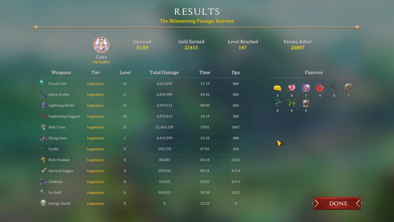 Remarks: Endless Tide has excellent Knock Back (going to test its usefulness for opening a path in Extreme mode, keeping certain elites away helps keep you alive, and it is convenient to open a path to chest drops, etc.). Crescent Blade is the superior Evolution for low and medium difficulty. The passive item Damage is highly recommended for all difficulties.