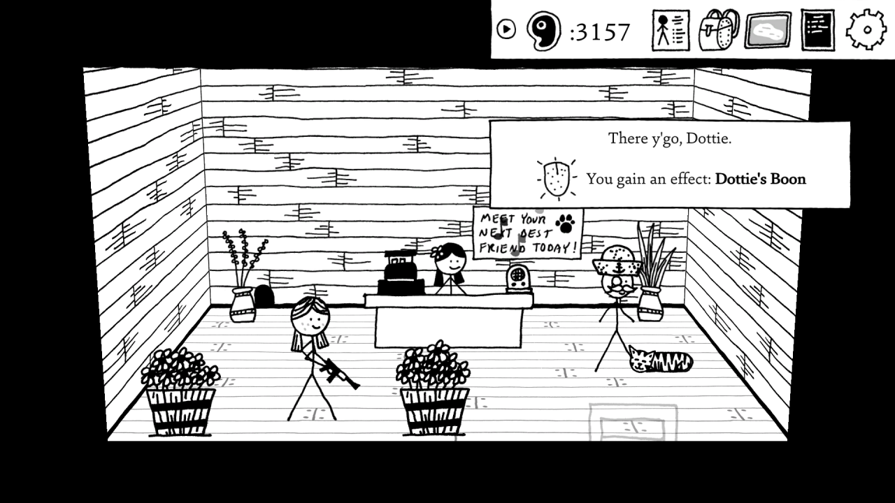 Go into the past at the pet store, and go inside. Attempt to disarm the mousetrap once. You’ll need 5 Moxie to actually disarm it the second time. Once you’ve done that, you can pet Dottie in the present.
