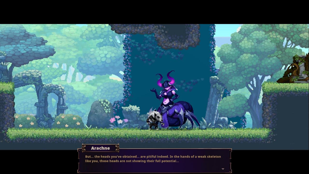 A new feature of the Skul 1.0 Update is Skull Upgrading. While on Early Access all Skulls were individual entities of their own, with their own rarity, you’ll now find lots of lower rarity Skulls that can be upgraded in order to obtain more powerful Skills and Buffs. The NPC responsible for Upgrades is Arachne, and she’ll only do them in exchange for incremental amounts of Bones (the most common upgrade pattern is 10 Bones, then 30 and finally 100). The number of Skulls in a Line -thus upgrades too- changes from Line to Line, and so will the amount of Bones Arachne will ask you for. She’s found on every level – at their entrance for all levels but the first, and at the middle for all of them.