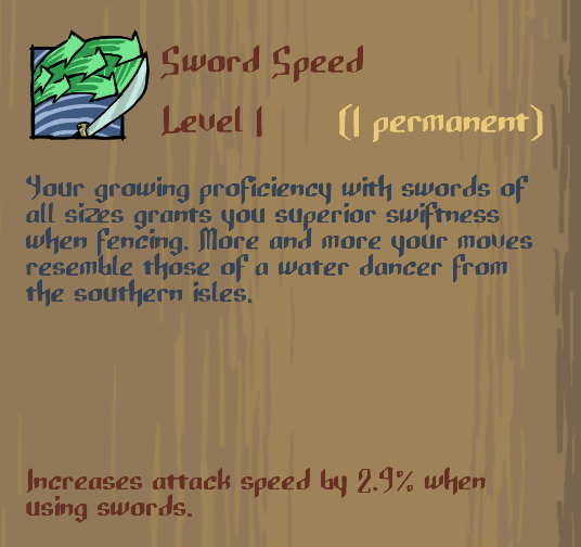 –Swords and daggers: Quick, but weaker weapons for quick slashes inbetween parries, or quick power attacks. Also can decapitate. (Special skill “Lunge” which grants a huge damage bonus when using the lunge power attack, “Sword Speed” which grants faster sword swing speed )
