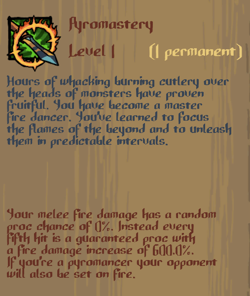Skill point 4: “Pyromastery”: Every fifth hit, you deal 600% of your current extra fire damage, also set foes on fire if you have the skill “Pyromancer”.