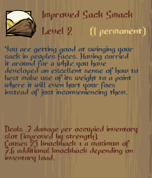 Skill Point 3: “Improved Sack Smack”: Your sack smack knockback is much stronger and deals damage.