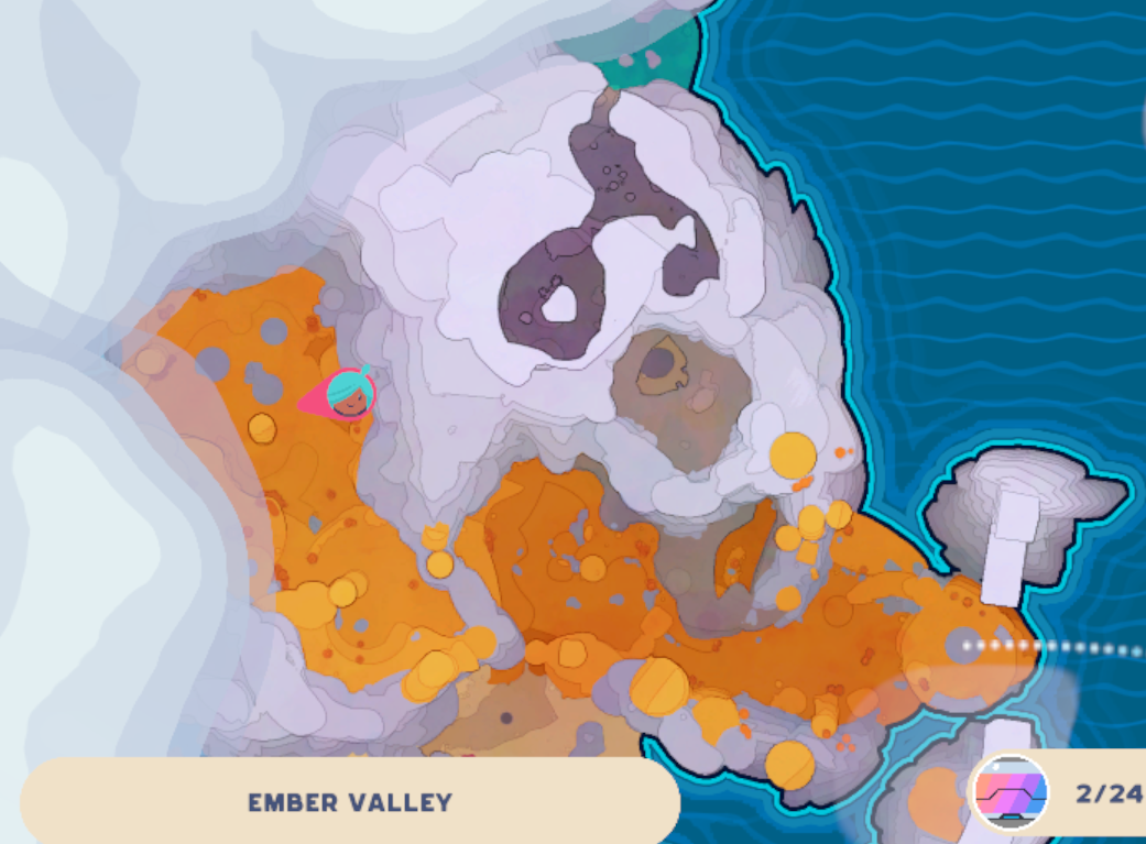 Elsewhere, you’ll eventually stumble across an area with 3 geysers in the form of a triangle, this is where the 1st Ember Valley Map is, you’ll have to launch on a geyser to get to it.