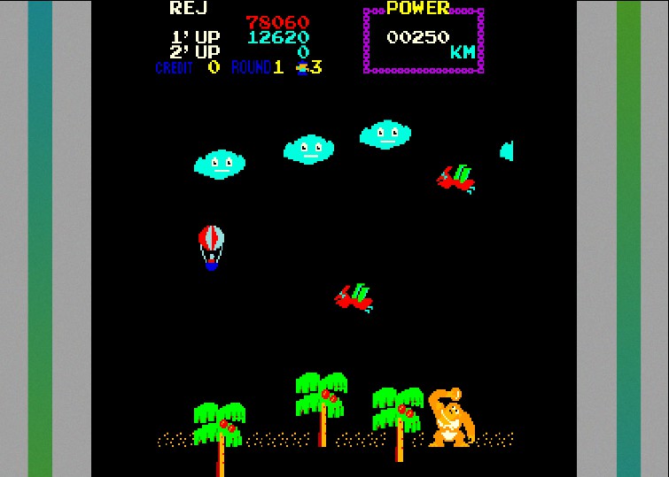 A couple things to point out that every other gorilla will toss the coconut upward only for it fall down and hit him on the head, giving you a free 500 points, and if the RNG of the pterries are favorable, the gorilla’s coconuts will hit a pterry and cause it to drop, netting you a small 200 point bonus.