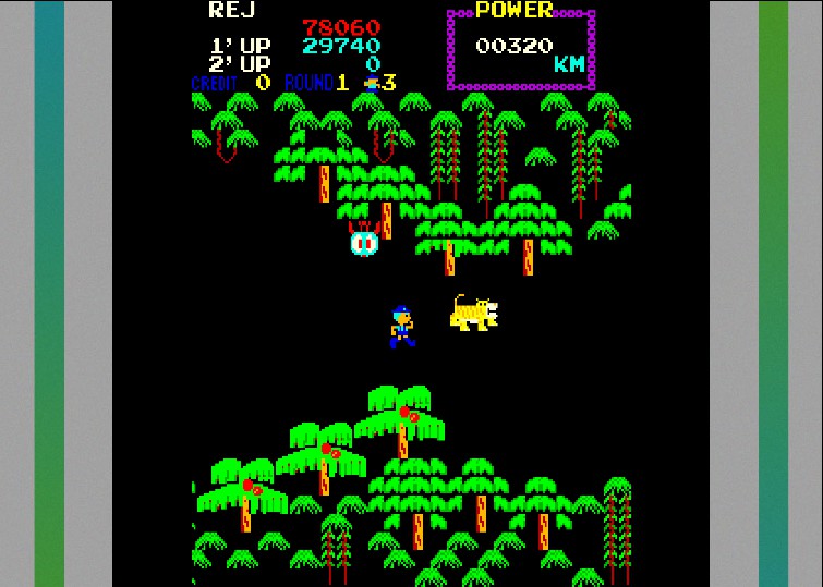The objective here is to walk two thousand kilometers to reach where Sherry is held captive. The two obstacles to watch out for are natives hiding in the trees waiting to jump onto you and the tiger that will walk across the screen from left to right.
