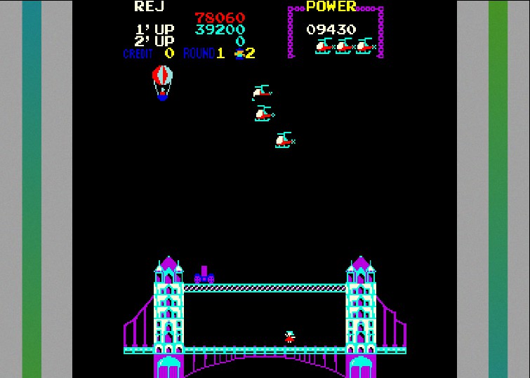 The answer to that is a large cannon the enemy has placed to shoot down the balloon. The key here is to get to the right side of the screen to draw the choppers and move across the cannon’s ironsights, with the idea that the cannon will inadvertantly shoot down the choppers.